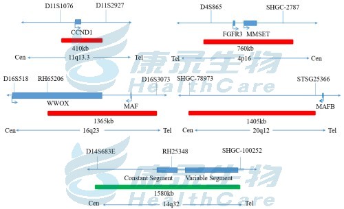CCND1/IGH为MM中最常见的异常易位;t (14;16)(q32;q22)发生于2-6%原发性MM;t (14; 20)该易位发生于2%MM,且预后差;t(4; 14)(p16; q32)发生于10%MM,且该易位常规核型分析检测不出,预后差及对化疗反应差。